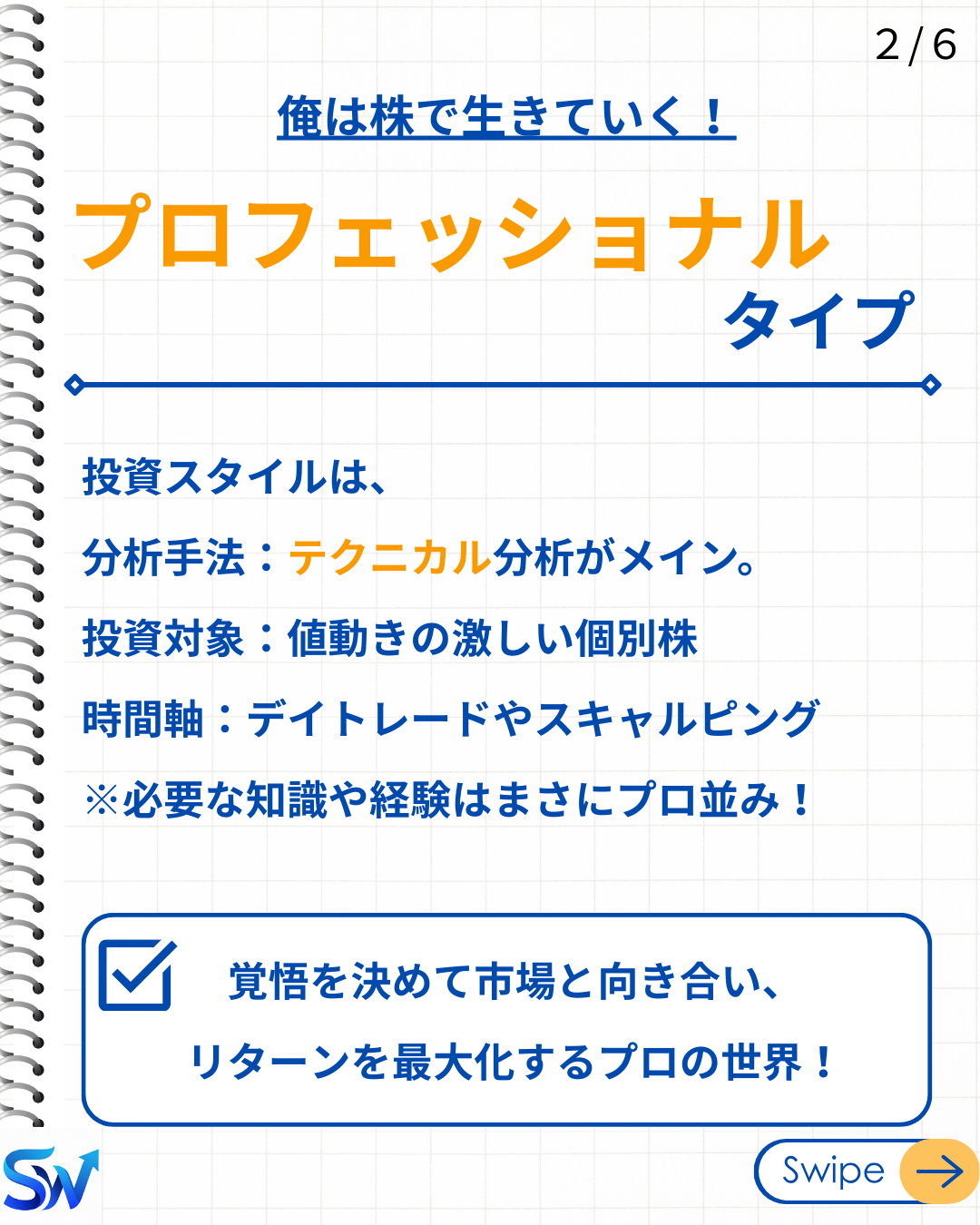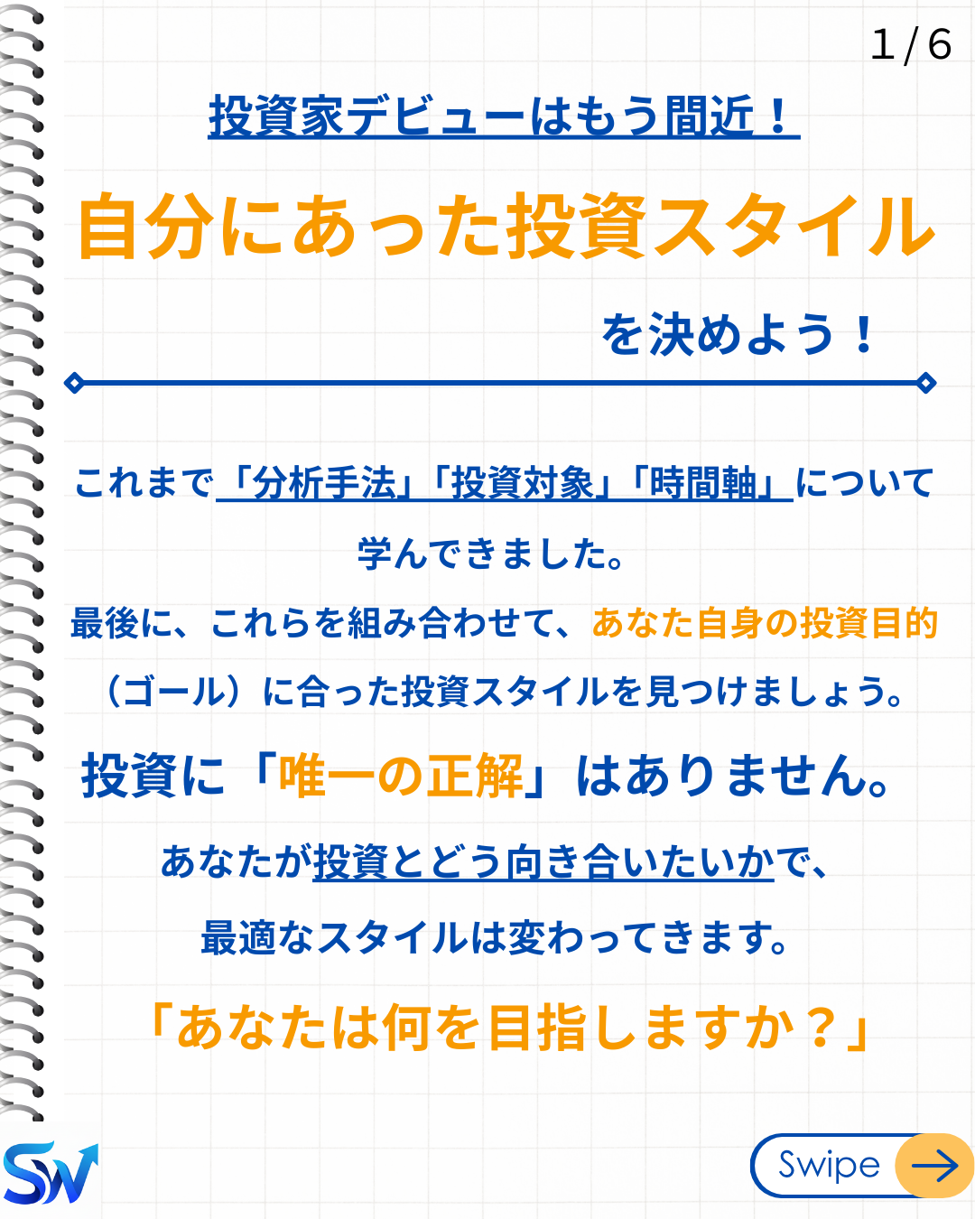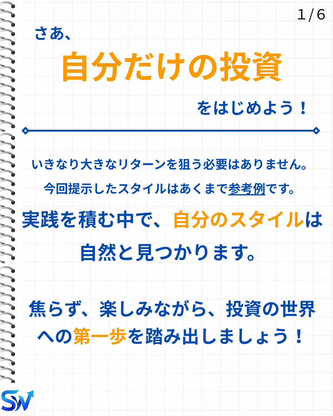 5-4. 自分の投資スタイルを見つけよう! 動画で学ぶ 動画で5-4. 自分の投資スタイルを見つけよう!について視覚的に学習しましょう。音声付きでより理解が深まります。 スライド資料 1 / 6 2 / 6 3 / 6 4 / 6 5 / 6 6 / 6 ❮ ❯ 理解度チェックテスト 自分の投資スタイルを確立する上で、最も重要でない要素は次のうちどれですか? リスクの許容度 投資目的と期間 他人の成功事例をそのまま真似すること 自分の知識や経験